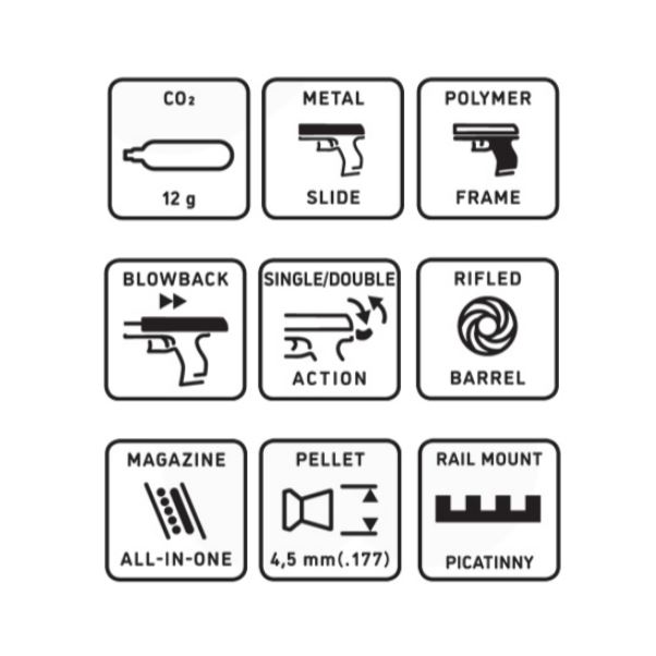 In appearance this Co2 powered airgun cuts a good figure alongside modern service pistols, with original dimensions, a heavy metal slide and a polymer frame with non-slip Hi-Grip surface.