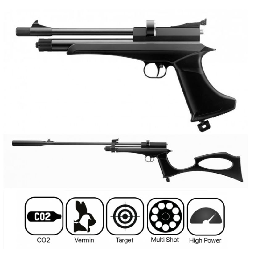 Includes 2 magazines, spare o rings and light weight threaded sound moderator that can be used on pistol and rifle.